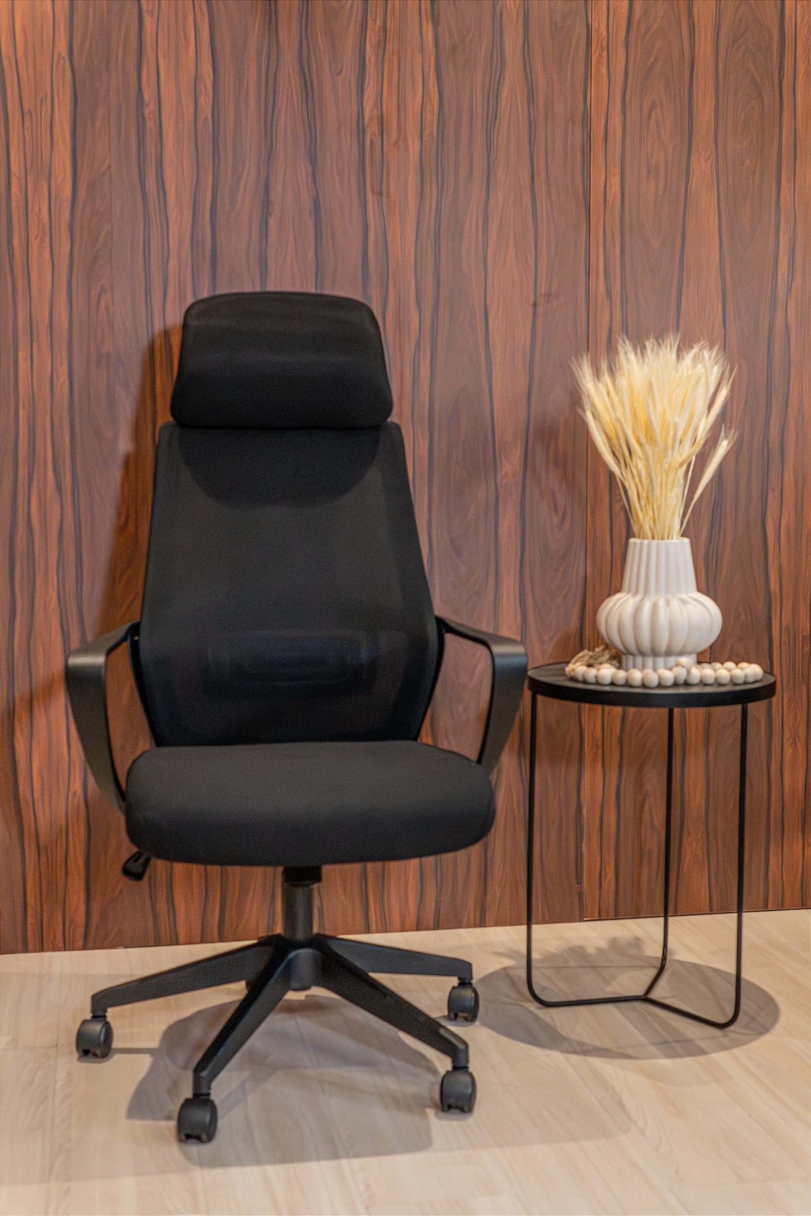 Montagem: A montagem dessa cadeira começa encaixando as rodinhas de nylon na base estrela preta e coloca o pistão no furo central. Depois, parafusa o mecanismo de metal embaixo do assento de tecido, fixa os braços de polipropileno nas laterais e prende o encosto em tela (mesh) que já vem com o apoio de cabeça integrado. Por fim, é só encaixar a parte de cima no pistão da base para a cadeira ficar firme e pronta para o uso.