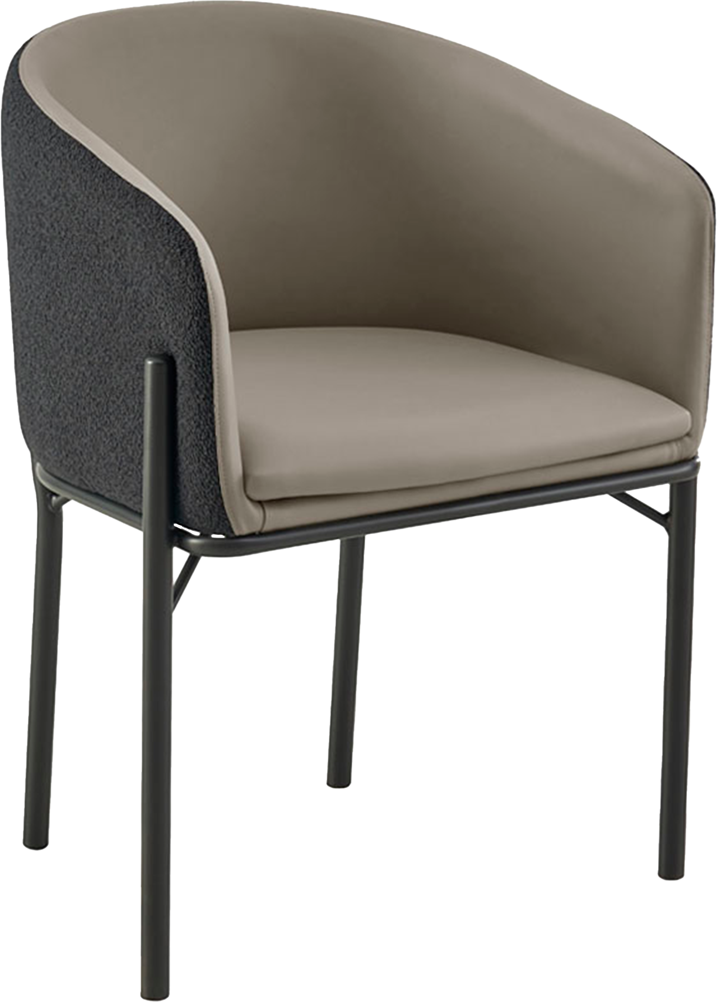 O revestimento combinado, que une superfície lisa e tecido texturizado, adiciona sofisticação e profundidade ao design, enquanto a base metálica confere firmeza, estabilidade e um toque moderno à composição. Versátil, a Naora é ideal para salas de jantar, ambientes corporativos, espaços gourmet e projetos de interiores elegantes e atuais.